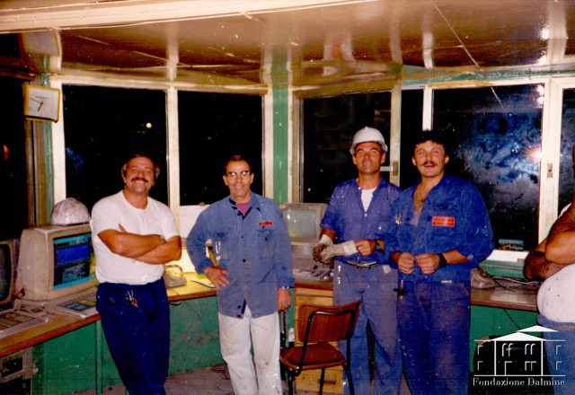 Franco Ghizzani, che ci ha donato questa fotografia, racconta che era leader all'interno della cabina e teneva i contatti con i vari reparti, mentre Venturi Villi, leader fuori dalla cabina, faceva i movimenti e controllava le siviere. Gino Biagioni era elettricista.