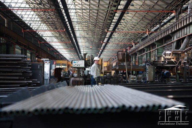 In questa fotografia l'operatore è ritratto al lavoro al bancale di raccolta dei tubi finiti.