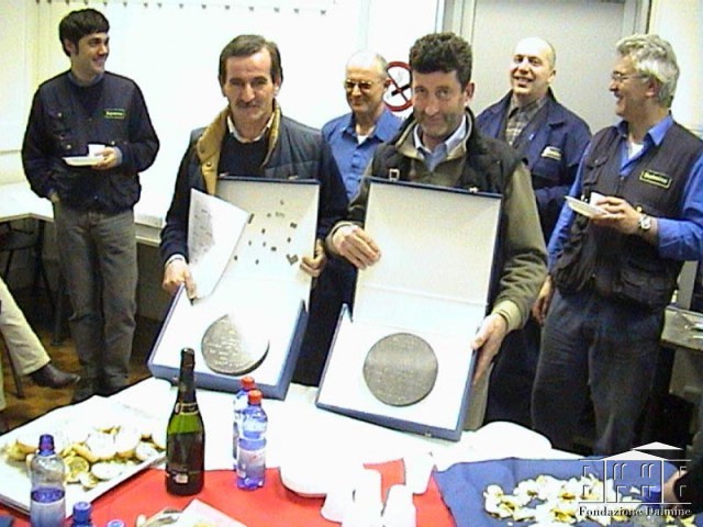 Festaggiamenti tra colleghi all'interno dello stabilimento per il pensionamento di Berlinghieri e Donadoni.