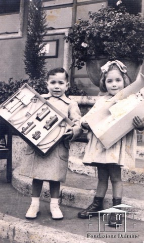 Stefania Pinti, che ci ha donato questa foto, racconta che ai bambini dell'ultimo anno di asilo veniva fatto un regalo. Qui è ritratta insieme a suo cugino Lido Rosa.