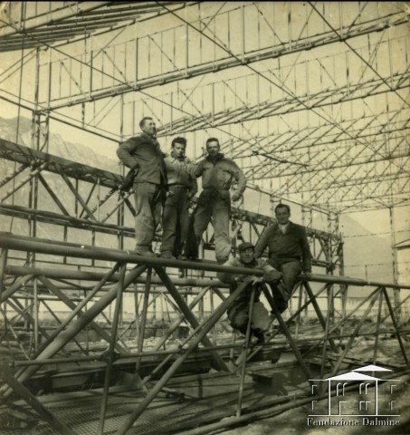 Il signor Macario racconta che il cugino di sua madre, ritratto in questa fotografia insieme ai colleghi, ha lavorato per conto di una ditta esterna alla costruzione dei capannoni dello stabilimento di Costa Volpino, inaugurato dall’azienda nel 1957.