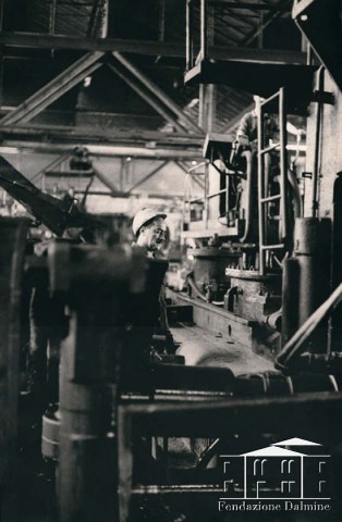 In questa fotografia l'operatore sta controllando la lavorazione al laminatoio.