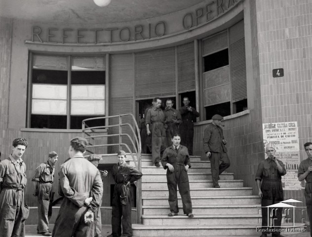 Lavoratori all'ingresso della mensa aziendale. 1940
