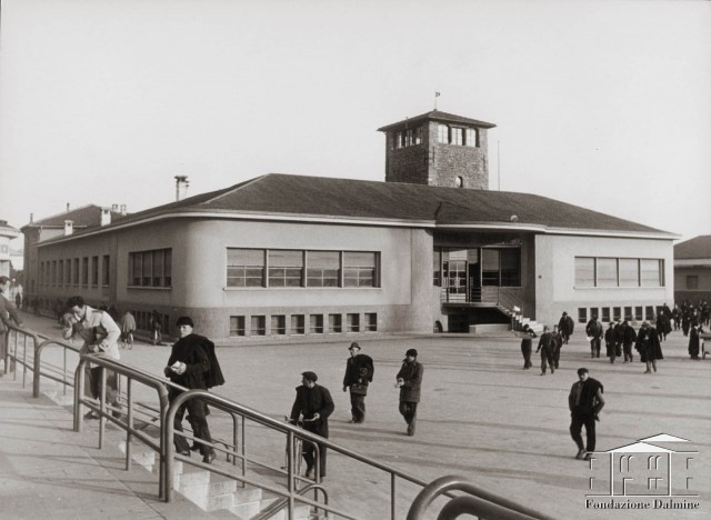 Lavoratori nel piazzale esterno della mensa aziendale. Seconda metà anni '30
