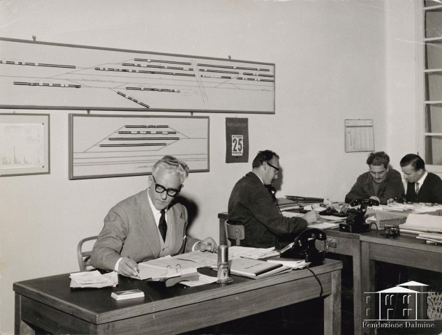 Giuseppe Merli al lavoro con in colleghi. 1960
