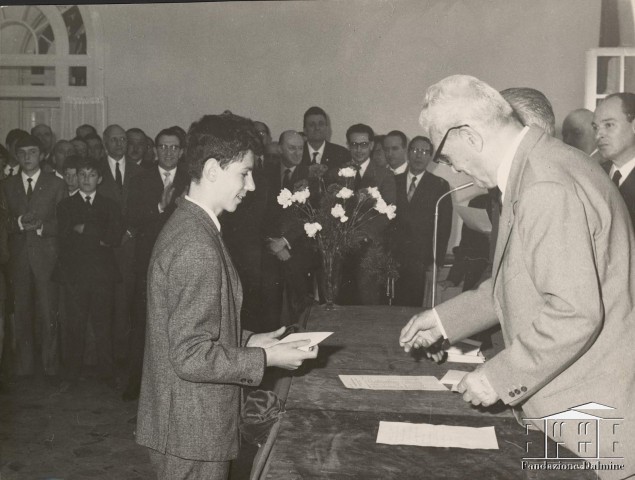 Il signor Bonetti racconta che anche suo padre e suo nonno hanno lavorato nello stesso stabilimento, infatti, in questa fotografia è ritratto mentre riceve una delle borse di studio aziendali riservate ai figli dei dipendenti.
