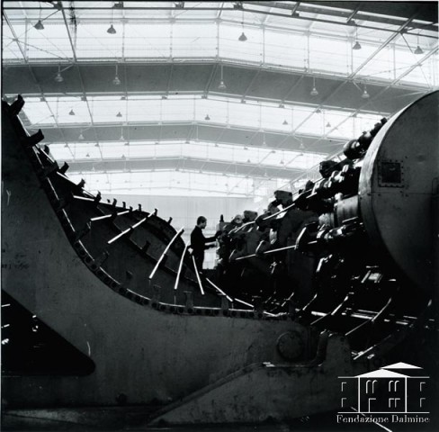 In questa fotografia l'operatore è ritratto al lavoro alla macchina per la prova idraulica automatica del processo di saldatura Fretz Moon.