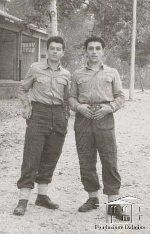 Benvenuto Arrigoni con un collega durante la leva militare. 1950