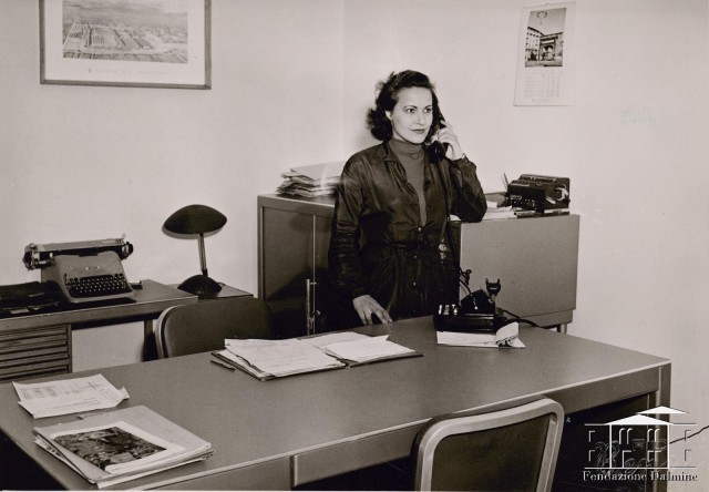 Questa fotografia รจ stata scattata a Franca Bertoni nello studio dell'ufficio regionale dell'azienda a Trento. La signorina Bertoni era in attesa del nuovo capo dell'ufficio, il ragionier Freschi.