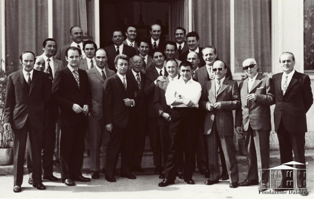 In questa fotografia, il Gruppo Lavoratori Anziani è riunito davanti al ristorante Il grillo, in occasione del pranzo per la conferma di Vincenzo Affatato come direttore dello stabilimento di Costa Volpino