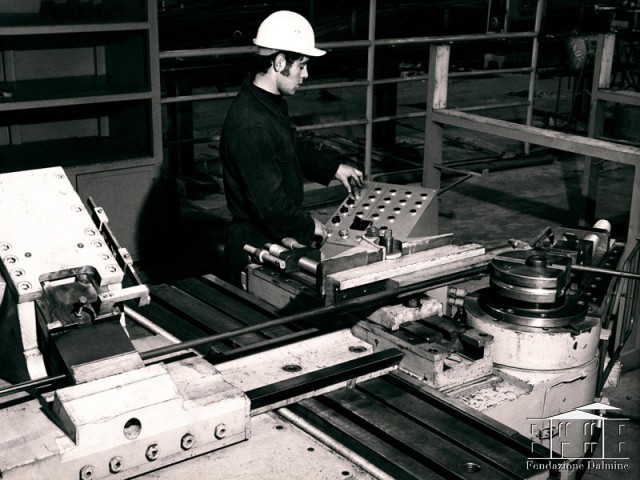 In questa fotografia l'operatore è ritratto al lavoro sulla macchina curvatrice dei tubi a U.