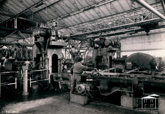 In questa fotografia l'operatore è ritratto al lavoro sul laminatoio pellegrino.