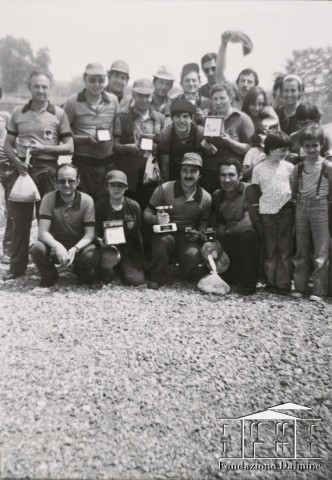 La squadra di pesca del Cral aziendale mostra i trofei dopo una gara. Anni '70
