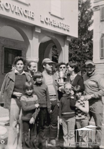 La squadra di pesca del Cral aziendale mostra i suoi trofei. Anni '70