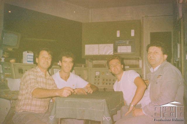 Operatori nella cabina di comando del forno dell'acciaieria in attesa della fusione. Anni '80