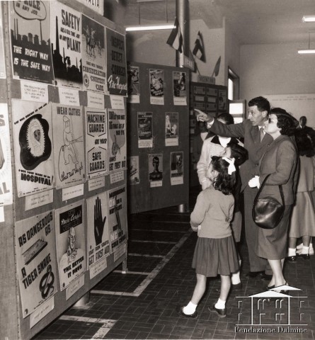 In questa fotografia i lavoratori e le famiglie visitano la mostra sulla sicurezza organizzata dall'azienda in collaborazione con l'ENPI - Ente Nazionale Prevenzione Infortuni di Firenze.
