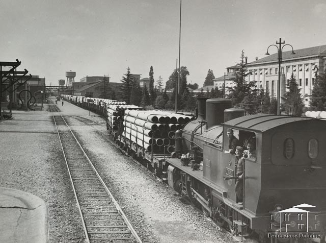 Trasporto tubi sulla linea ferroviaria aziendale. Anni '40