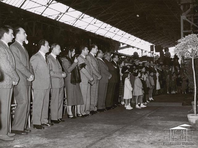 Dipendenti e famiglie alla cerimonia religiosa nello stabilimento. Anni '60