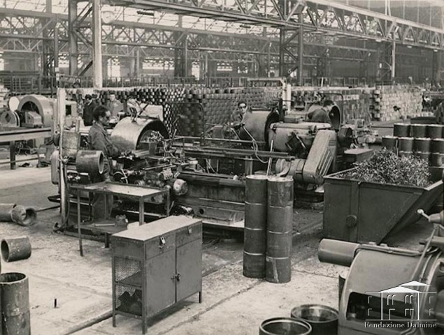 In questa fotografia il primo operatore è ritratto al lavoro sul tornio Morando per la fabbricazione dei manicotti.