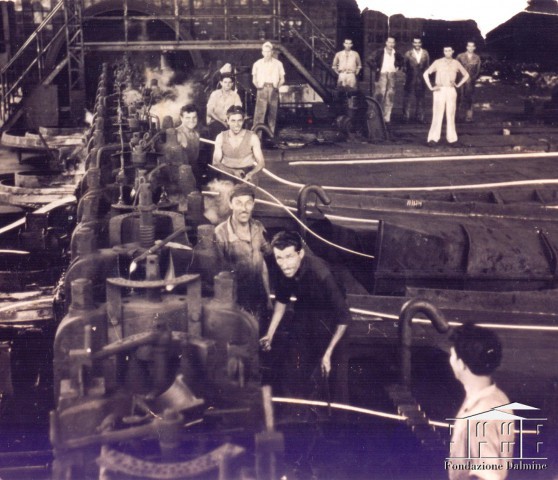 Aldo Fiaschi, che ci ha donato questa fotografia, racconta che il treno laminatoio 320 è detto 'serpentaggio' per la sua caratteristica di laminazione del tondo da 6 a 22 mm.