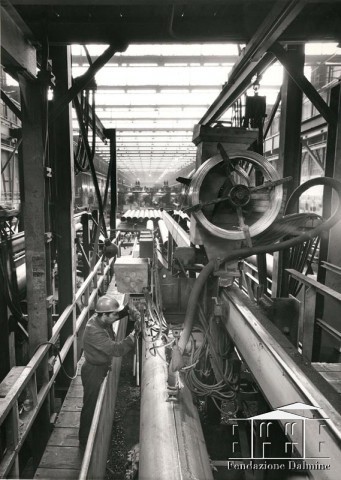 Operatore al lavoro alla tagliatrice tubi. Seconda metà anni '60