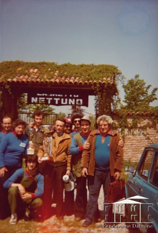 La squadra di pesca del Cral aziendale mostra i trofei vinti dopo una competizione. Anni '70