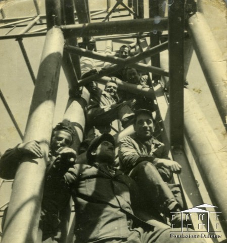 Il signor Macario racconta che il cugino di sua madre, ritratto in questa fotografia insieme ai colleghi, ha lavorato per conto di una ditta esterna alla costruzione dei capannoni dello stabilimento di Costa Volpino, inaugurato dall'azienda nel 1957.