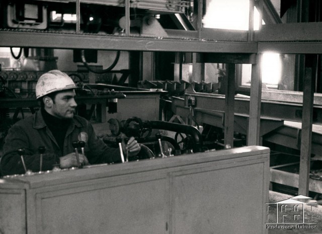 Operatore al pannello di comando della pressa a estrudere. Seconda metà anni '60