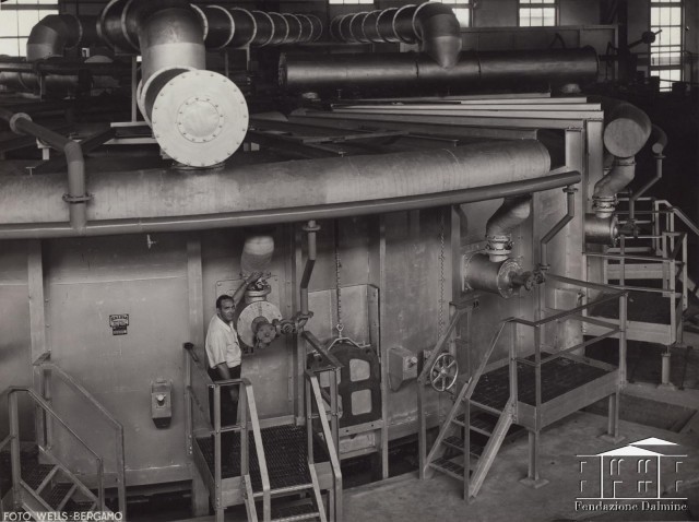In questa fotografia, in particolare, l'operatore è ritratto alla base del forno rotativo per il riscaldo dei lingotti di acciaio prima della laminazione.