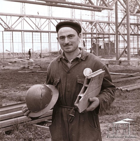In questa fotografia è ritratto Antonio Cabossi indenne dopo aver avuto un incidente sul lavoro, grazie all'uso del casco protettivo.