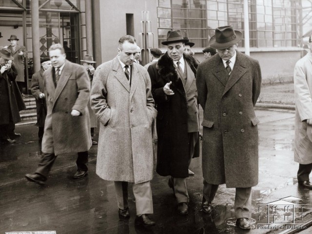 In questa fotografia alcuni membri della X Commissione parlamentare vengono accompagnati in visita allo stabilimento di Dalmine dai dirigenti della società .
