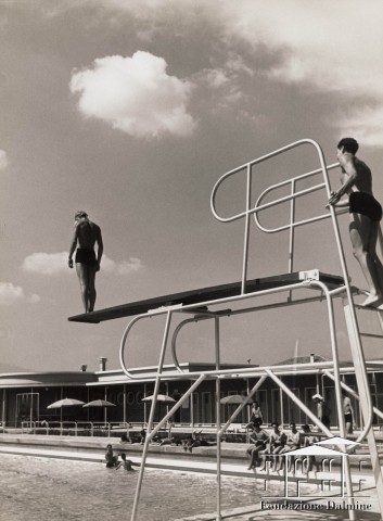 Tuffatori sul trampolino della piscina aziendale. Seconda metà anni '30
