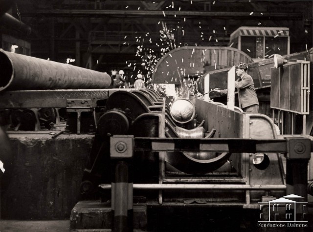 Taglio dei tubi con la sega a caldo nel reparto di laminazione e aggiustaggio. Anni '50