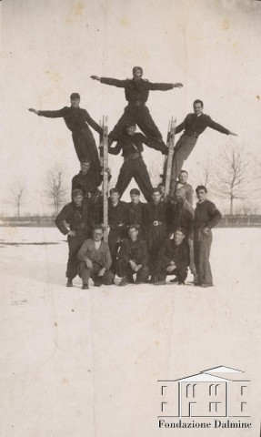 Pietro Salvetti e il corpo dei pompieri in posa acrobatica sulla neve. Anni '50