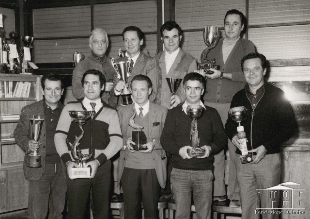 La squadra di pesca del Cral aziendale mostra le sue vittorie. Anni '70