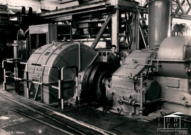 In primo piano in questa fotografia è ritratto il motore del laminatoio allungatore.