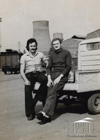 Carlo Foiadelli con un collega in uno dei piazzali dello stabilimento. Anni '70