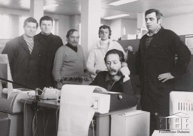 Giuseppe Lardo, che ha donato questa foto, ha iniziato a lavorare nello stabilimento di Dalmine nel 1966 per conto di una ditta esterna. La mansione di manutentore generico gli permette di conoscere tutti i reparti operativi della fabbrica. In questi stessi anni frequenta un corso d'istruzione tecnica a Bergamo e consegue l'attestato di specializzazione in chimica. Nel 1970 viene assunto così dall’azienda come manutentore nel reparto elettrico. Nel 1976 viene trasferito in laboratorio per l’analisi dei campioni dell’acciaieria e alla fine degli anni ‘80 lavora al laboratorio centrale come tecnico delle analisi gassose fino al 1994, anno in cui va in pensione. In questa fotografia è ritratto insieme agli operatori spettrografici del laboratorio a lavoro insieme ai tecnici della Philips.