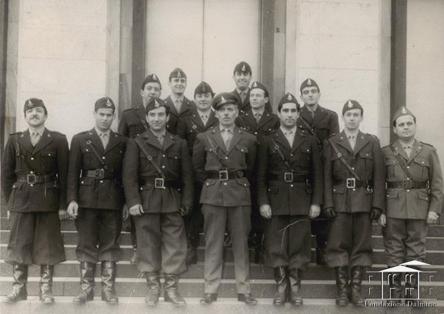 Foto di gruppo di Pietro Salvetti con i colleghi di fronte al palazzo della Direzione. Anni '40