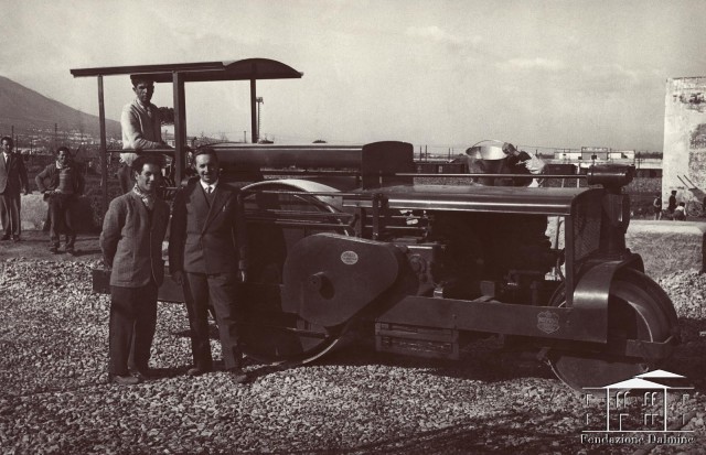 In questa fotografia, il sig. Nittoli è ritratto con Pelosi, dirigente dell'impresa esecutrice dei primi lavori di costruzione, e il gruppo di operai impegnati nella fase di livellamento del terreno per l'impianto dello stabilimento.